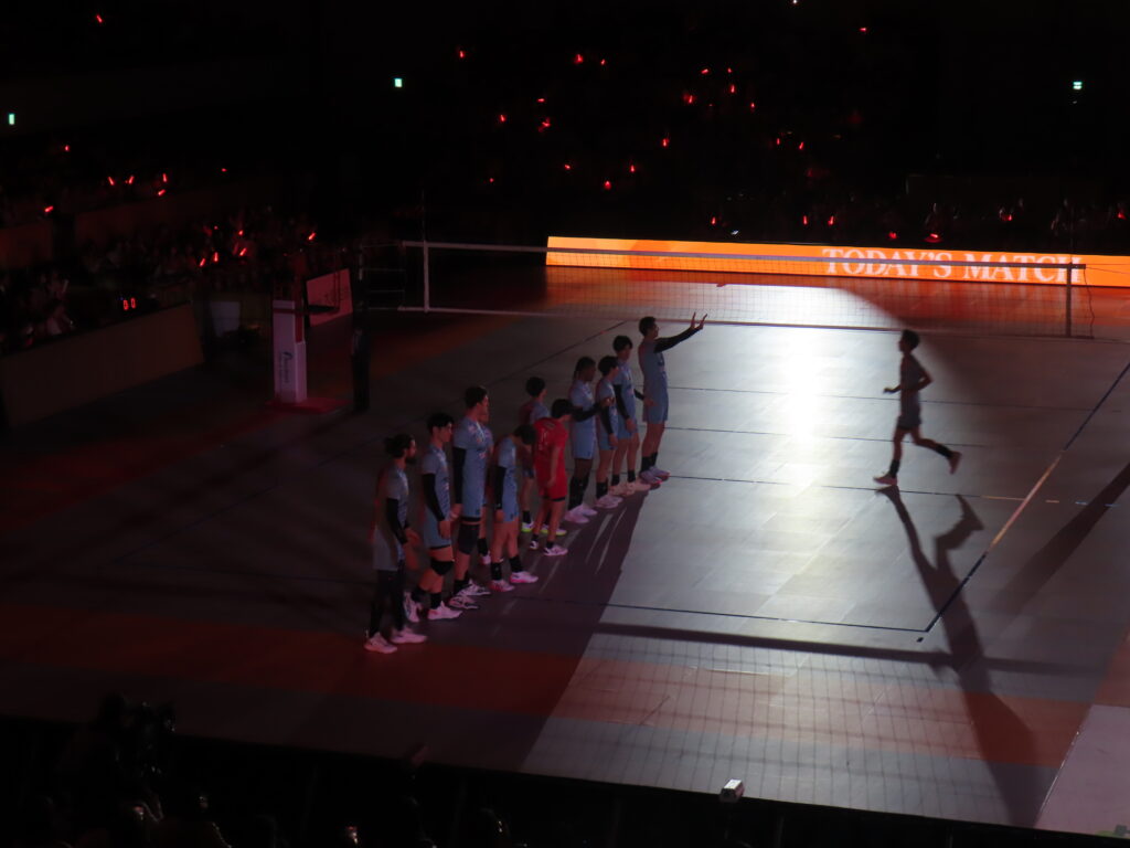 アウェイチームのスタメンがコート内に入り、ホームチームのスタメン紹介。ペンライトは、ホームチームの色に。