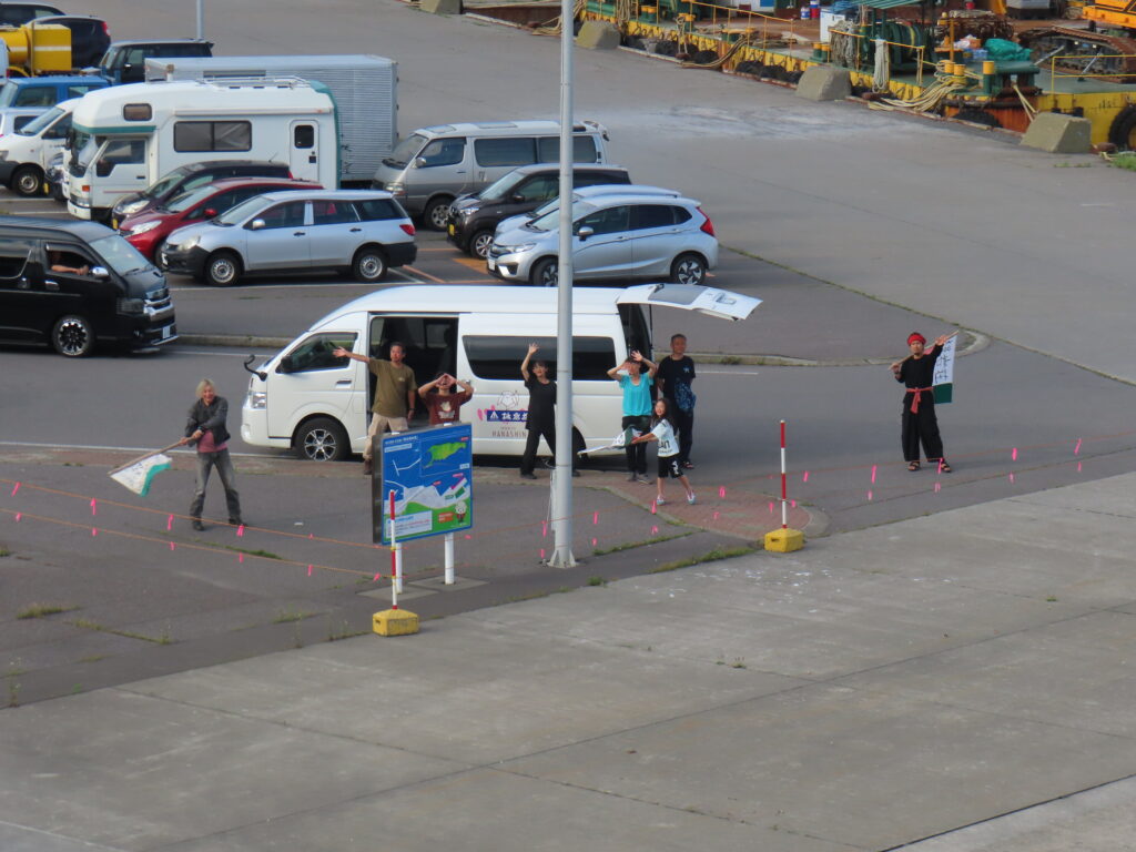 ラジオ体操が終わると、朝イチの船に乗るため歩いて港へ行く方を盛大に見送ります。