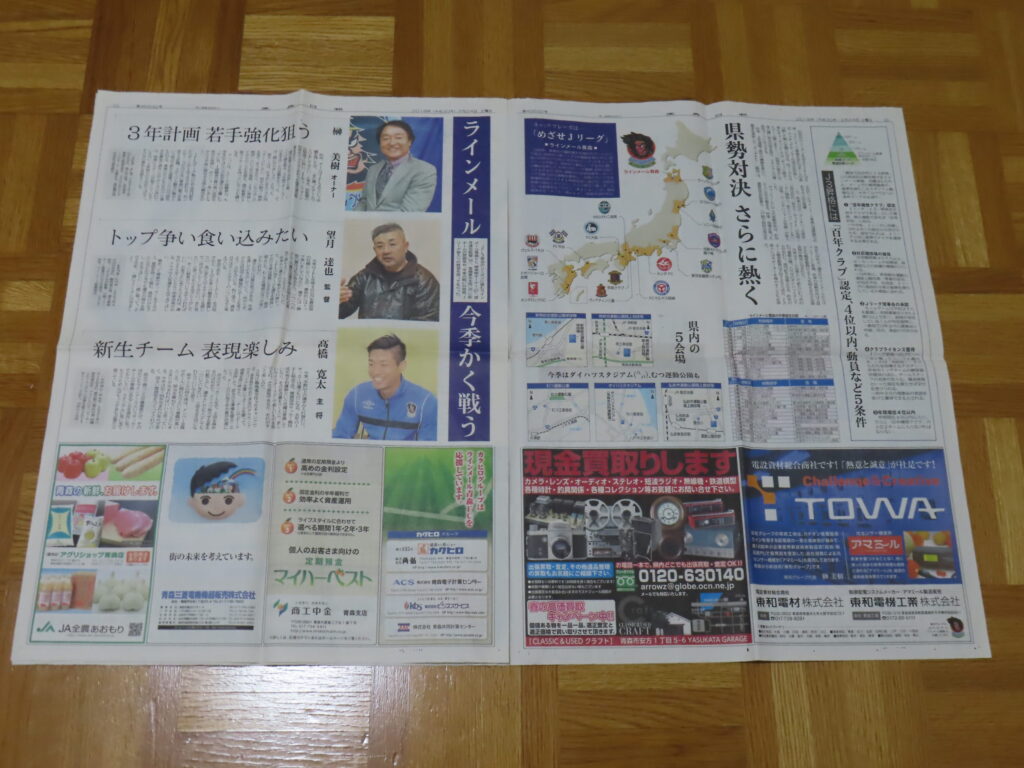 同じJFLでも、ラインメール青森は地域シェア№1の東奥日報が大々的に取り上げています。